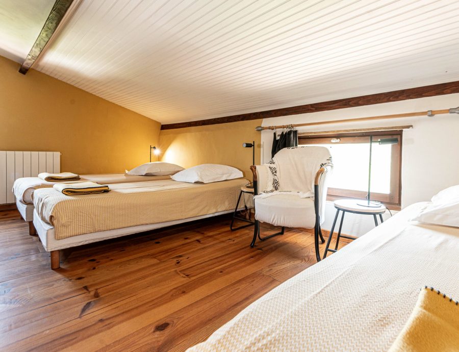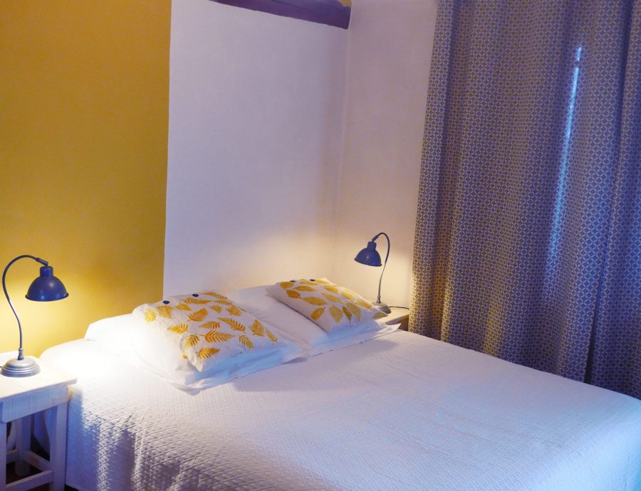 Dans des tons « terre et crème », cette chambre est particulièrement agréable. Deux fenêtres donnent au sud ; elles sont équipées de rideaux en draps de fil et de volets. Lits faits pour votre arrivée !